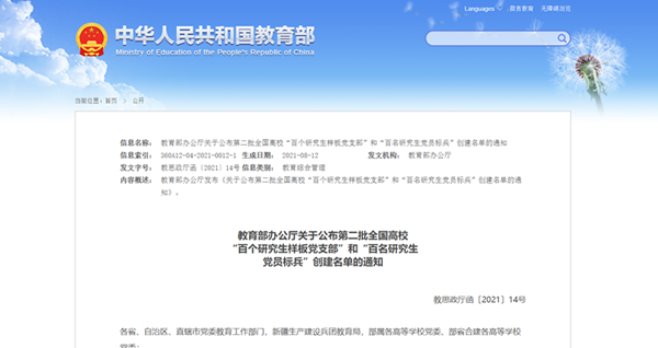 根据《教育部办公厅关于开展第二批全国高校“百个研究生样板党支部”和“百名研究生党员标兵”创建工作的通知》(教思政厅函〔2020〕14号)安排,经组织推荐、通讯评审、集中会审、结果公示,遴选产生100个研究生样板党支部和100名研究生党员标兵。