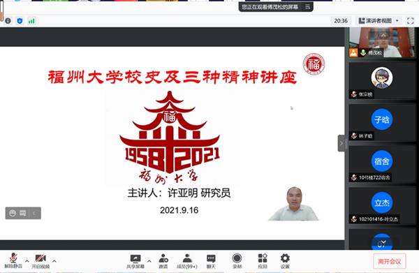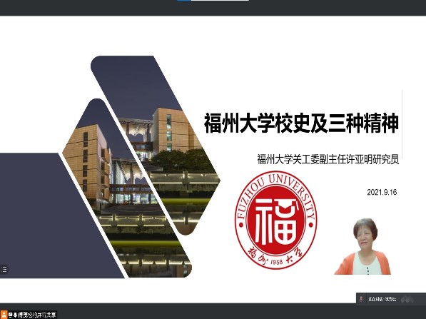 为提高我院2021级新生入学教育成效,教育引导学生进一步感悟校史底蕴,培育爱校荣校情怀,加深新生对福州大学“三种精神”的认识,增强对学校的归属感、认同感和自豪感, 9月16日晚上,学院邀请校关工委副主任许亚明研究员为2021级新生举行了“福州大学校史及三种精神”线上专题讲座。讲座由学院党委副书记傅茂松主持。