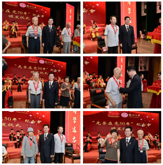 全国共有710多万名老党员获得了首届“光荣在党50年”纪念章,我院有6位党员老教师荣获该纪念章。他们分别是:计算机系退休教师、国家级专家、两度荣获福建省“劳动模范”称号的康金章教授(党龄64年),数学系退休教师李淑英副教授(党龄63年),计算机系退休教师林啟宇老师(党龄60年),计算机系退休教师魏麟应老师(党龄59年),计算机系退休教师陈荣山副教授(党龄51年),计算机系退休教师李金炼副教授(党龄50年)。颁发仪式上,学院党委书记陈笃钦研究员逐一为老同志颁发纪念章(因特殊原因,李淑英老师的纪念章由卢旋珠老师代为领取),现场师生以雷鸣般的掌声为党员老教师们致以最崇高的敬意。