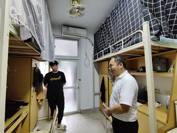 10月14日下午,我院党委副书记傅茂松带领学院全体专兼职辅导员,前往学生生活区,深入学院学生宿舍和活动室,关心学生学习和生活状态,并开展消防安全、用电安全等自查自纠工作,督促我院学生做好个人宿舍内务卫生,对存在的安全隐患问题,建立专项整治工作记录,要求学生现场整治,辅导员及时跟踪了解相关宿舍的完成情况,并将一些情况反馈给学校相关部门。