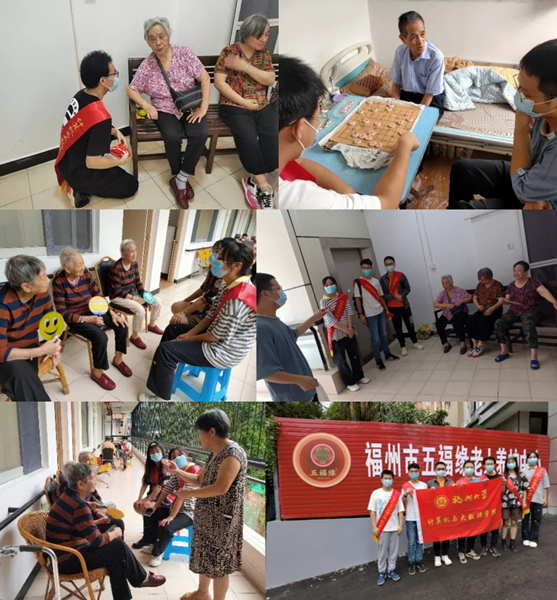 当日下午,志愿队们到达福州市五福缘老人养护中心。志愿者们帮忙整理了中心的运动器材,打扫中心卫生;并向老人们分发水果,为他们表演魔术,一起合唱《我和我的祖国》、《让我们荡起双桨》等经典歌曲。随后,志愿者们还分组陪伴老人,他们陪老人下棋、谈心,进一步了解他们的生活,聆听老人们的故事,并向老人们讲授了养生知识。