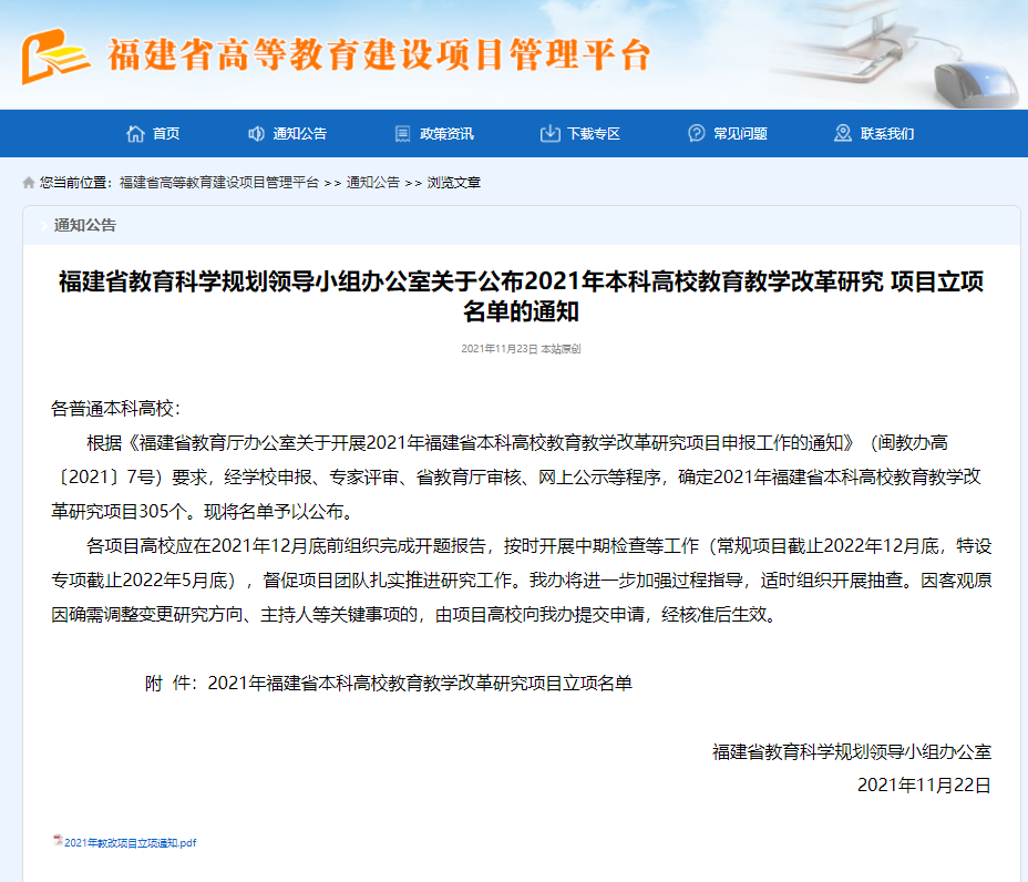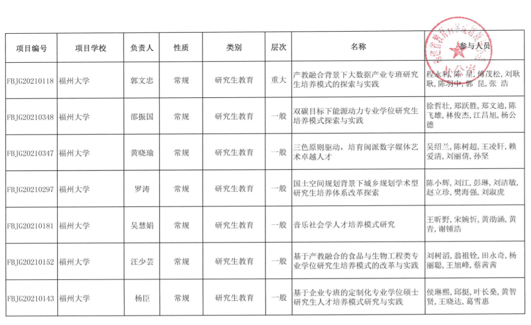 2021年福建省本科高校教育教学改革研究项目立项名单公布,我院郭文忠教授牵头的“产教融合背景下大数据产业专班研究生培养模式的探索与实践”获得福建省研究生重大教改项目资助。这是我院首次获批福建省研究生重大教改项目,在本次申报中,福州大学仅获批1项研究生重大教改项目。
