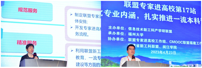 为深入学习贯彻习近平新时代中国特色社会主义思想,落实立德树人根本任务,大力推进本科教育的内涵发展,积极推动新工科再深化、再发展,全面提高教育教学水平和人才培养质量,努力开创本科教育新局面,2023年4月23日,由信息技术新工科产学研联盟主办,福州大学承办,联盟专家进高校工作组、CMOOC联盟福建工作委员会、福建省新工科教育联盟、闽江学院协办的“联盟专家进高校”系列活动第17站在福州大学成功举办。